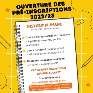 L’institut Al Imane de Clermont-Ferrand (créé en 2013) lance officiellement aujourd’hui les pré-inscriptions pour la rentrée 2022-23.